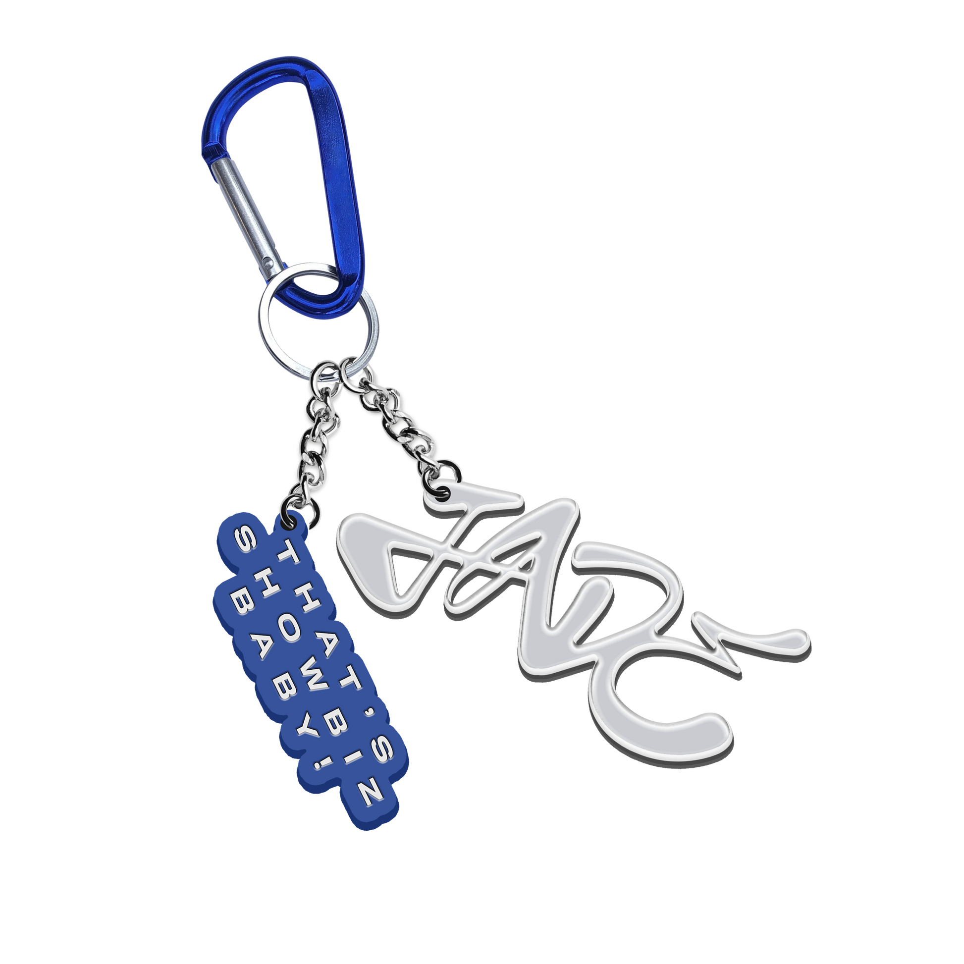 - Dual-charm carabiner keychain: JADE logo + “THAT’S SHOWBIZ BABY!” print