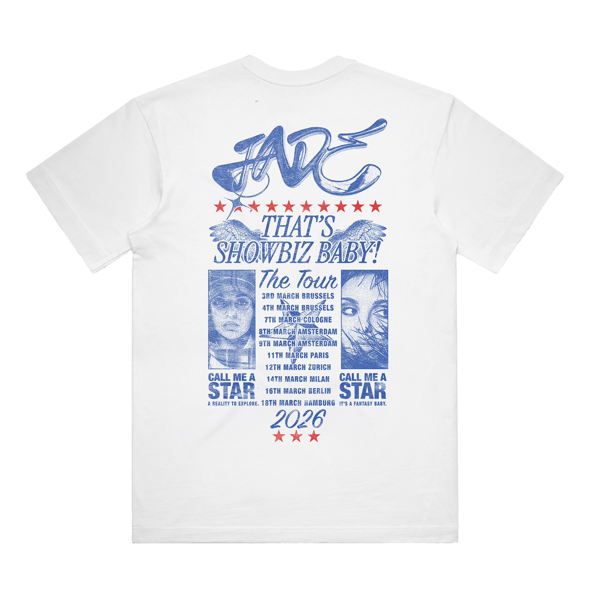 The THAT'S SHOWBIZ BABY! tour dateback tee celebrates JADE's THAT'S SHOWBIZ BABY! 2026 tour.